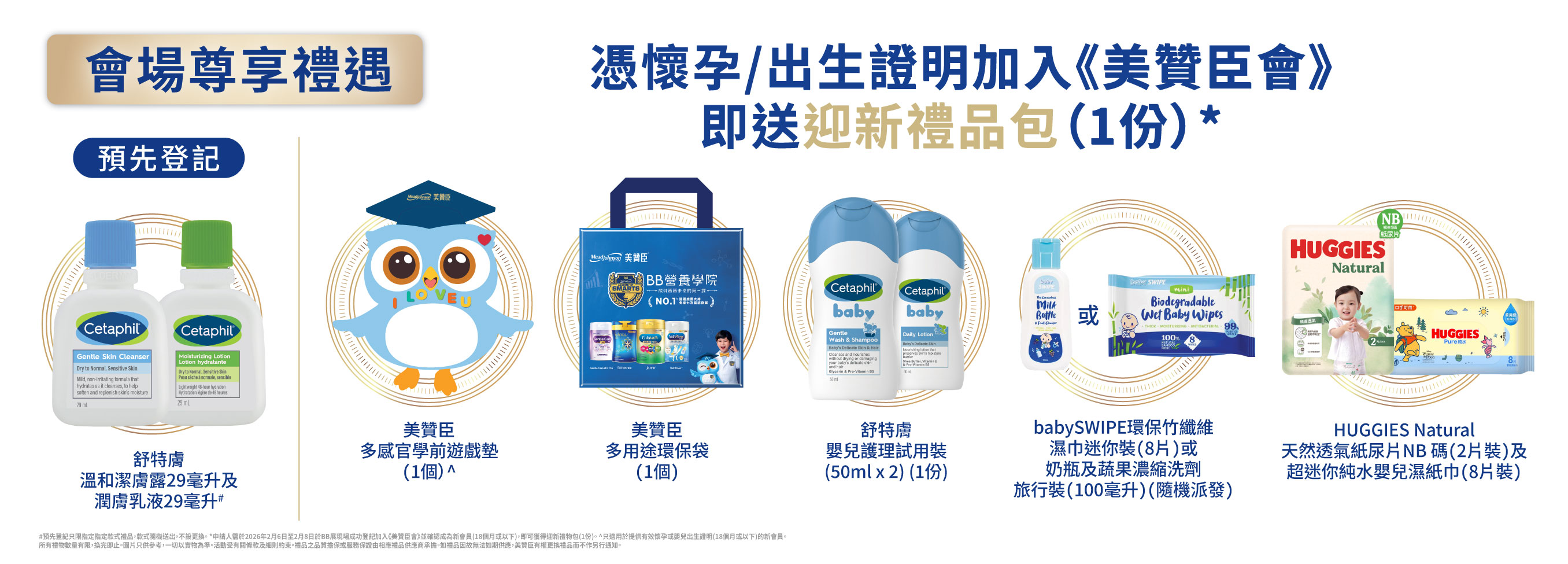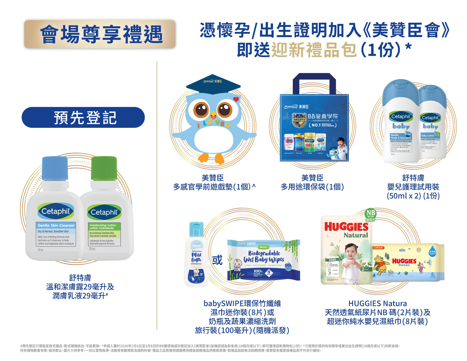 - 禮品之品質擔保或服務保證由相應禮品供應商承擔。如禮品因故無法如期供應。美贊臣有權更換禮品而不作另行通知。所有推廣不適用於一號配方奶粉。